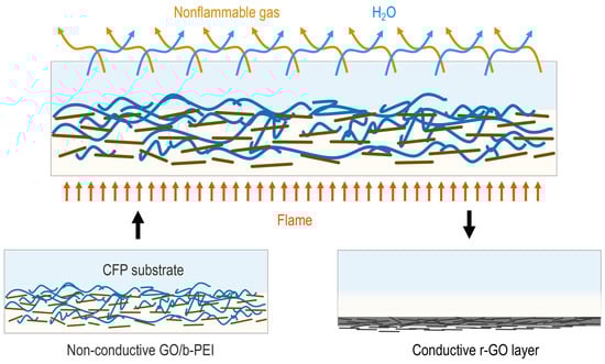 In this respect, GO-based coatings have many advantages. GO is rich in hydrophilic functional groups, allowing it to be dispersed into aqueous solutions and further processed into two- or three-dimensional architectures [19,20]. GO also is biocompatible and has antibacterial properties [21,22,23,24]. Moreover, as a carbon-based material, GO will not burn spontaneously or generate byproducts that can have negative effects on the environment. More importantly, in the process of heating, GO can be reduced or partially reduced to rGO and transition from being an insulator to a semiconductor [25,26]. This chemical transition provides a means of creating an early warning signal for fire. Based on these properties, the present work develops a diffusion-driven self-assembly strategy (DDSAS) to functionalize packaging papers using GO and b-PEI as starting materials. The DDSAS starts by incorporating the branched polyethyleneimine (b-PEI) into the cellulose microfiber network of the paper. Then, the electrostatic interactions between GO and b-PEI drive GO assembly and the formation of a densely stacked and layered coating on the paper surface. In this coating, GO serves as the skeleton and the PEI polymer acts as the “adhesive”. The prepared ultra-thin coatings not only significantly enhance the flame-retardancy of the paper, but can also provide an alert to a fire emergency. Heating the coating results in the reduction of GO to form reduced-GO (rGO), and the coating changes from an insulator to a semiconductor as a result of this transformation.