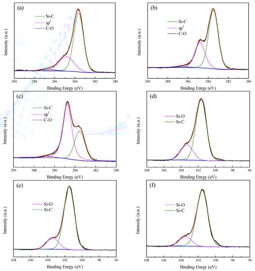 XPS spectra fitting of Si peak and C peak (a) 1000 °C—C peak, (b) 1100 °C—C peak, (c) 1150 °C—C peak, (d) 1000 °C—Si peak, (e) 1100 °C—Si peak, (f) 1150 °C—Si peak.