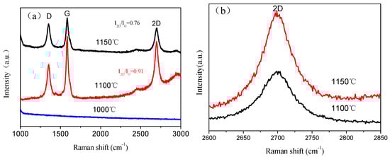 Figure 3a shows the results of a surface Raman spectroscopic analysis of the Si substrate after deposition in a CO atmosphere. It can be seen that there were no D, G, or 2D peaks in the Raman shift range of 1000–3000 cm−1 on the sample prepared at 1000 °C/3 h, indicating that the C content was too low at this time; this is consistent with the XPS results of C element (Figure 2a). When the reaction temperature increased to 1100 °C, a significant D peak (1350 cm−1), G peak (1580 cm−1), and 2D peak (2690 cm−1) appeared on the surface of the sample, indicating that a graphene film layer had formed. Further calculation showed that the 2D peak width of graphene was 50.79 cm−1 (see Figure 3b), and the I2D/IG was about 0.91. It could also be observed that the number of graphene layers on the Si surface was close to 2 [,]. When the reaction temperature increased to 1150 °C, significant graphene characteristic peaks (D peak, G peak, and 2D peak) remained, in which the graphene 2D peak width increased to 55.86 cm−1 (see Figure 3b) and the I2D/IG was reduced to 0.76. The calculation shows that there were three to five graphene layers.