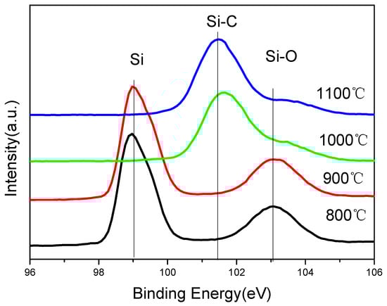 It can be seen that during the CVD reaction at 1100 °C/3 h, CO could react with the Si substrate at the interface, and finally, a Si/(SiC + SiO2)/Gr multilayer structure could form. Therefore, to study the formation mechanism of the multilayer structure, CVD treatments at 800 °C/1 min, 900 °C/1 min, 1000 °C/1 min, and 1100 °C/1 min were carried out in a CO atmosphere and a surface XPS analysis was performed (Figure 4). It can be seen that when the temperature was higher than 800 °C, the surface of the sample was mainly Si and SiO2, indicating that at this time, Si reacted with CO, forming SiO2 on the surface of the silicon wafer. However, the content of SiO2 was relatively small, and the XPS could still detect the matrix. When the temperature increased to 900 °C, the sample surface was still dominated by Si and SiO2, and the XPS diffraction peak characteristics were the same as those at 800 °C. In contrast, when the temperature reached 1000 °C, the characteristic peaks changed significantly: the Si peak disappeared, the SiO2 peak almost disappeared, and a prominent SiC diffraction peak appeared, which indicated that a (SiC + SiO2) layer was formed at this time. Additionally, the thickness of the layer was relatively high and the graphene completely covered the Si substrate. When the temperature continued to rise to 1100 °C, the characteristic peaks of SiC on the sample surface were sharper, the full width at half height was smaller, and the characteristic peaks of SiO2 could hardly be found. These results show that CO gas reacts with a Si substrate from 800 °C to form SiO2 first, followed by SiC, with SiC + SiO2 forming together on Si substrates [,].