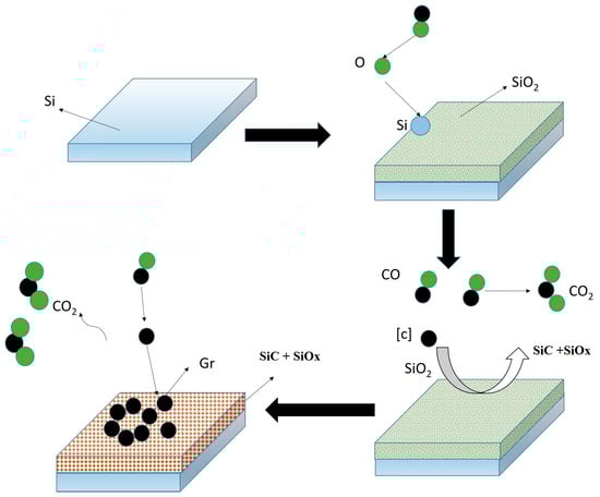 Based on the above analysis and thermodynamic calculations, a reaction mechanism for preparing graphene films on silicon surfaces using CO as a carbon source is presented in Figure 5. At 800–900 °C, Si will react with O (the O generated by CO cracking) in CVD to form a SiO2 layer on its surface (Equation (1)) []. When the temperature increases to 1000 °C, the CO in the CVD will undergo a cracking reaction to generate [C] and CO2, and the newly generated [C] will react with the SiO2 on the surface to generate SiC (Equations (3) and (4)) [,]. In addition, [C] will diffuse into the interior through the mixed layer of SiO2 and SiC and continue to react with SiO2 and Si to generate SiC, increasing the thickness of the SiC and SiO2 layers (Equations (4) and (5)). On the other hand, the mixed layer of SiO2 and SiC generated on the surface creates conditions for [C] to aggregate, nucleate, diffuse, and grow, finally forming a uniform graphene layer. In addition, the CO2 produced in the CVD reaction during graphene growth will also etch the graphene film, inhibiting the accumulation of [C] in the direction perpendicular to the silicon wafer and promoting the growth of graphene in the plane direction, thereby reducing the number of graphene layers and improving the quality of the film layers [].