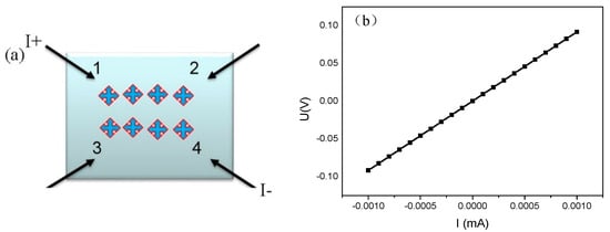 The four-probe method was used to estimate graphene films’ resistivity and sheet resistance. During the measurements, four graphene electrodes measured the current between adjacent electrodes and the voltage between another pair of adjacent electrodes. As shown in Figure 6, when no magnetic field was applied, its volt–ampere characteristic curve was a straight line passing through the origin, indicating that the experimental electrode was in good ohmic contact with the graphene (Equation (6)) []: