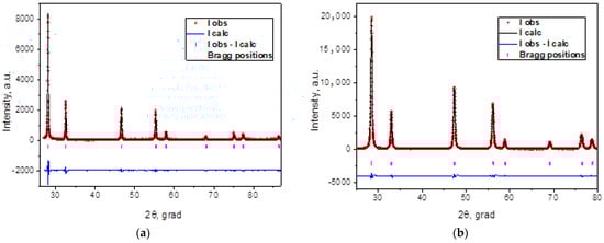 The results of the XRD characterization of the EDB and SDC electrolyte materials are represented in Figure 1. The materials were single-phase and exhibited a cubic-type structure (Table 1), with the unit cell parameters being close to those presented in the literature [,,].