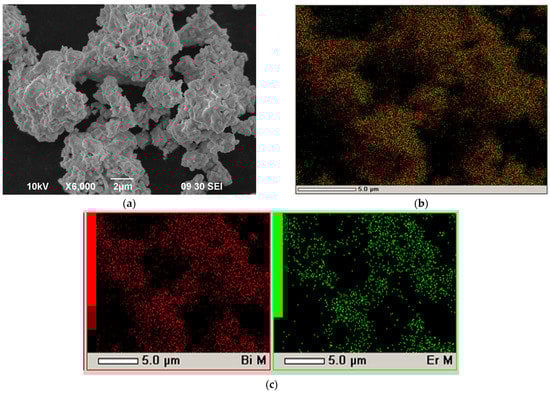 SEM image of the EDB electrolyte powder (Tcalc = 700 °C) (SEM image): (a) agglomerates, ×6000; (b) integral map of elements’ distribution; (c) and individual element’s maps.