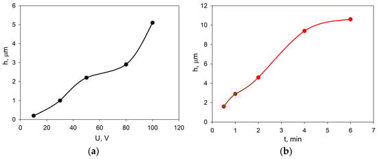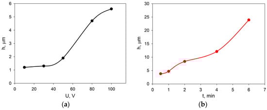 Dependences of the EDB coating thickness, obtained from a suspension in isopropanol with the addition of PEI and acetylacetone, on a Ni foil model electrode: (a) at a constant deposition time of 1 min and various voltages; (b) at a fixed voltage of 80 V and various deposition times.