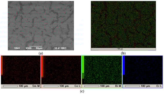 SEM image of the surface of the EDB coating (first deposition–sintering cycle) on the SDC substrate (EDB-2 sample, Tsint = 850 °C, 5 h) obtained using EPD from an EDB suspension in isopropanol with PEI and acetylacetone additives: (a) surface, ×500; (b) integral map of elements’ distribution; (c) individual element’s maps.