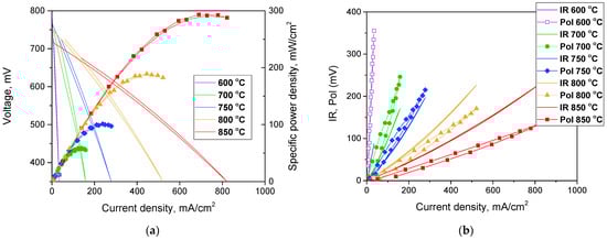For electrochemical characterization of the SDC electrolyte with an EDB barrier layer, a Pt/SDC/EDB/Pt cell was fabricated, as described in Section 2.4. The current–voltage characteristics were collected in the temperature range of 600–850 °C and the MPD values were calculated. Additionally, the polarization and ohmic (IR) resistance of the cell were measured using the current interruption method. The results are shown in Figure 10a and Figure 10b, respectively. The main characteristic of the cell is the constant increase in the MPD values up to 850 °C, which is not typical for cells with supporting MIEC electrolytes. Usually, the cell performance decreases at temperatures higher than 800 °C due to the reduction of ceria in the anode conditions, which becomes significant at such high temperatures [,]. The MPD values are 12.6, 58.9, 101.2, 187.3, and 293.2 mW cm−2 at temperatures of 600, 700, 750, 800, and 850 °C, respectively. The obtained values are much higher than those obtained by Wachsman et al. in a cell with a supporting SDC electrolyte with an Er-doped Bi2O3 barrier layer and Pt/Au electrodes (51 mW cm−2 at 800 °C []) due to the reduction in the total electrolyte thickness from 800 to 562 µm. The OCV values obtained in this study were in the range of 725–750 mV and were close to those obtained for cells with doped Bi2O3 layers of similar thicknesses deposited with dip coating []. It should be noted that the polarization resistance of Pt electrodes was quite high and exceeded the ohmic resistance contribution even at such a high temperature as 750 °C. Due to the low sintering temperature established in this study for the EDB layer deposited using EPD, for future studies it would be preferable to use composite electrodes with Bi2O3 additives with reduced sintering temperatures that have been developed in various studies [,], including our own [], which possess excellent electrochemical activity at decreased temperatures (polarization resistance as low as 0.6 Ω cm2 at 600 °C []). This is important, as electrode polarization influences not only the cell performance, but also the OCV value. Thus, the replacement of the model Pt cathodes used in this study would help further improve the cell performance.