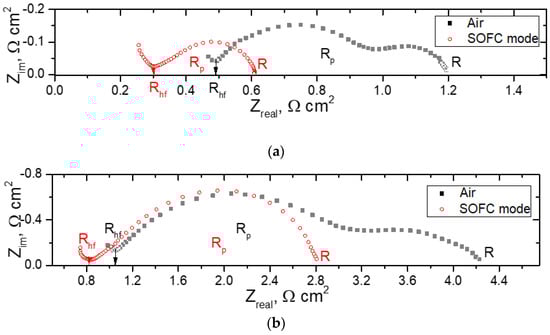 To obtain information about the contributions of the electrolyte and the electrodes, the impedance of the cell was measured under air in both channels (designated as “Air”) and under OCV conditions with air and wet hydrogen (3% H2O) in the cathode and anode channels, respectively (designated as “SOFC mode”). The typical spectra are presented in Figure 11. Although the single-cell impedance was fairly complicated, the intercept of the impedance arc at the low-frequency side with the real axis usually embodies the overall cell resistance (R), while the inflection point on the impedance spectra at the high-frequency section represents the serial resistance (Rhf), which includes the electrolyte ohmic resistance as the main component, as well as the electrode/electrolyte interface resistance and the lateral resistance of the electrodes. Therefore, the difference between two intercepts represents the overall polarization resistance (Rp) from both the anode and cathode.