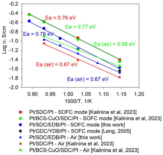 where h is the total electrolyte thickness, including the supporting SDC electrolyte and the EDB coating. Figure 12 shows a comparison of the Arrhenius dependence of the conductivity with those obtained for SDC electrolytes without and with various barrier layers formed by EPD [,]. In the SOFC mode, the electrolyte conductivity is lower than that of SDC without electron-blocking layers and with a BaCe0.8Sm0.2O3 + 1 wt. % CuO (BCS-CuO) anode barrier layer. However, it is similar to that of SDC with an Y-doped Bi2O3 coating, thus demonstrating the superior effectiveness of Bi-based cathodes to block electrons. In air, the SDC-EDB conductivity is higher than that of the SDC electrolyte due to the higher conductivity of EDB, and lower than that of BCS-CuO-SDC due to electronic conductivity in the BCS-CuO electrolyte under air conditions. The deposition of an EDB layer results in increasing the electrolyte conductivity; however, it does not change the activation energy of its conductivity (values are shown in Figure 12 using the relevant colors).
