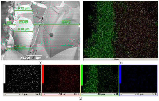 Figure 13 shows the SEM image of a Pt/SDC/EDB/Pt cell after testing in the SOFC mode. As shown in Figure 13a, the EDB layer has a dense sintered structure, and the layer thickness is in the range of 5–7 µm, which is lower than the calculated one. Good adhesion between the EDB layer and the SDC substrate should be noted, and this was maintained after three days of testing. Diffusion of bismuth cations was observed in the bulk of the SDC substrate. The inhomogeneity of the EDB layer may be related to its partial evaporation during the sintering process as well as baking of the Pt electrodes. However, the effect of the EDB layer manifested itself on the conductivity and power characteristics of the Pt/SDC/EDB/Pt cell (Figure 11 and Figure 12). It should also be noted that the EDB layer obtained using EPD had a superior density compared with Bi-containing coatings obtained with screen-printing [,,]. In general, obtaining dense Bi-containing layers is a challenging task, which can mainly be realized through complicated physical methods such as PLD and magnetron sputtering []. In this sense, a simple and inexpensive method of electrophoretic deposition offers undoubted advantages.