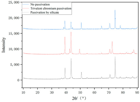 The X-ray diffraction (XRD) pattern depicted in Figure 1 illustrates the crystal structure of the non-passivation coating and the coating treated with various passivation modes. Analysis of the figure reveals that no new peak generation or displacement is observed in the XRD pattern between the coating and the passivation-treated coating. This observation suggests that the passivation film applied to the coating does not influence the crystal structure during the XRD measurement process. There is speculation that the passivation film may be insufficiently thick, and the constituents thereof are not readily discernible. The results of Zhang et al. [41] showed that XRD showed no significant difference between electroplating and sodium molybdate conversion coating, indicating that the passivation film thickness was very thin, which was consistent with the experimental results. Presumably, the trivalent chromium and silicate passivation films are very small, typically between 5–15 nm, and almost impossible to see.