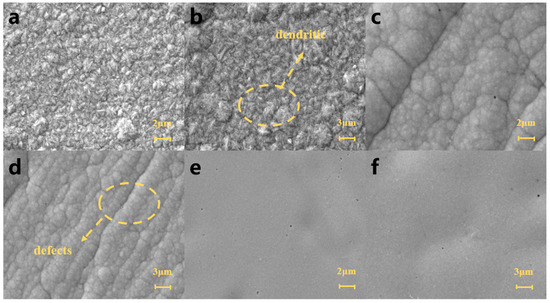 Figure 2a,b depict the microscopic magnification of the unpassivated sample at 3k× and 5k×, respectively. The images reveal a rough surface with significant particle adhesion and numerous dendrite-shaped structures present in the area. The increase in structural defects results in a larger surface area and a decline in corrosion resistance performance. The formation of defects during the coating preparation process is the underlying cause. The occurrence of these defects can be attributed to the fluctuation in current density and the non-uniform distribution of ions within the plating solution during the coating preparation process. Figure 2c,d depict the microscopic magnification of the trivalent chromium passivated sample at 3k× and 5k×, respectively. The figures demonstrate that the surface morphology after trivalent chromium treatment is relatively flat, with the disappearance of the dendritic structure and the absence of large particles. However, small tissue particles are still present. Sandberg et al. [42] demonstrated that the surface composition of the sample may consist of a complex mixture of Cr2(SO4)3, Cr2O3, Cr(OH)3, ZnSO4, and ZnO compounds. Figure 2d reveals the presence of surface defects, including holes and flaky films, which suggest non-uniform formation of passivation films [43]. This suggests that the majority of surface defects in the coating can be remedied, leading to an enhancement in corrosion resistance. However, a small number of surface defects remain unresolved. Figure 2e,f depict the microscopic magnification of the silicate passivated sample at 3k× and 5k×, respectively. The images reveal a flat surface devoid of any discernible defects, complete absence of dendritic structure, and uniformity in the tissue particles. These figures suggest that the coordination of negatively charged SiO2− or SiO2 gel with Zn2+ may lead to the formation of the passivation film. The incorporation of tannic acid facilitates the generation of hydroxyl and carboxyl groups essential for the passivation of the film and enhances its formation. Upon comparison of the surface morphology resulting from three distinct treatment methods, it is evident that the unpassivated coating exhibits a greater prevalence of large metal particles and dendrite structures. While chromate passivation serves to essentially eliminate surface defects, small tissue particles remain present. In contrast, silicate passivation treatment results in the complete eradication of surface defects, yielding a uniform and compact surface.