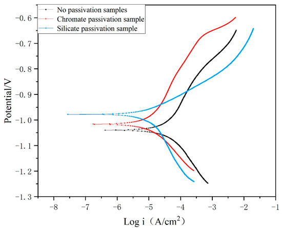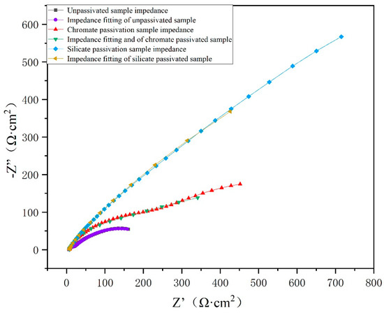Figure 4 displays the EIS curve of three samples immersed in a 3.5% NaCl solution. The radius of the impedance arc is a reliable indicator of the strength of corrosion resistance. The electrochemical parameter that exhibits the highest reliability in characterizing the corrosion resistance of the samples is the impedance value at low frequency and the enhanced high-frequency region, as determined through electrochemical impedance measurement. It was obvious from the figure that the samples without passivation have the smallest arc radius and impedance, and the worst corrosion resistance. After passivation surface covered with a layer of passivation film, The radius of low-frequency capacitive reactance arc increased significantly, the high-frequency area was also improved, the corrosion impedance values were increased, showing that the passivation membrane could obviously increase the corrosion resistance of the substrate, and the main body in physical isolation corrosive medium and chemical inhibition of charge transfer and electrochemical corrosion. There might also be a conversion film on the unpassivated sample, which might be a natural oxide film formed under natural conditions and could not provide the same performance as the passivated film. The corrosion resistance of silicate passivation film was the best in the passivation film formed.