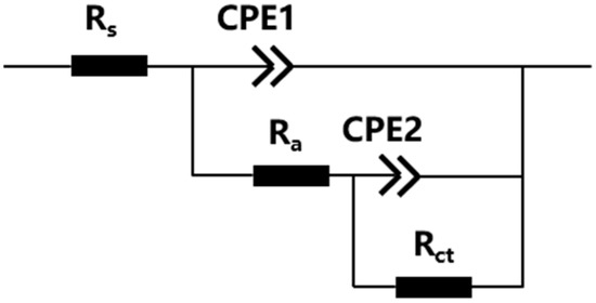 The equivalent circuit diagram employed in fitting is depicted in Figure 5, wherein Rs denotes the solution resistance, Ra represents the coating resistance, Rct signifies the charge transfer resistance, and CPE-1 and CPE-2 denote two constant phase elements. Figure 6 reveals the presence of minute cracks on the passivation film, which fragment it into multiple sections. The parallel resistances of these sections cannot be disregarded, thereby rendering CPE-1 non-equivalent to capacitance C. Additionally, the passivation film’s cracks allow ions in NaCl solution to traverse it and access the substrate, making CPE-2 non-equivalent to capacitance C. Table 4 displays the fitting outcomes of the EIS data for the three samples. The Rp value, which is the sum of Rs, Ra, and Rct, was observed to be 3010.84 Ω·cm2 for the silicate passivated sample, 1075.10 Ω·cm2 for the trivalent chromium passivated sample, and 265.78 Ω·cm2 for the non-passivated sample, as indicated in the table. The significantly lower Rp value of the non-passivated sample suggests that passivation can greatly enhance the coating’s corrosion resistance. Furthermore, the highest Rp value was observed for the silicate passivated film, indicating its superior protective ability.