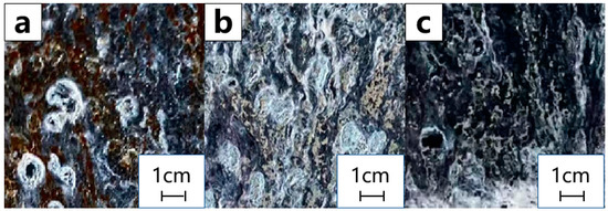 Figure 7. Surface of three samples after 72 h salt spray measures ((a): unpassivated sample, (b): trivalent chromium passivated sample, (c): silicate passivated sample).