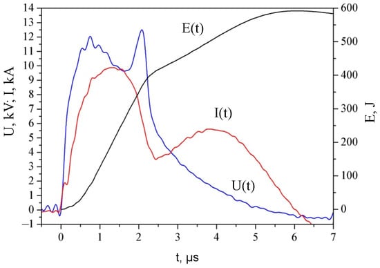 The time dependences of I(t), U(t) and the energy introduced into the wire E(t) are presented (Figure 1). In accordance with the classification of the time dependences of current and voltage characteristic of EEW, the explosion of the Ti64 alloy is similar to the explosion of other Group II metals with a high boiling point and high heat content at the melting temperature, for example, Fe and Ni []. For group II metals, the discharge current I(t) reaches its maximum value by the time the conductor melts.