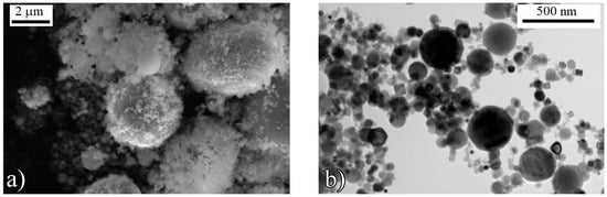 In micron-sized particles (Spectrum 1, Figure 5a), the amount of aluminum is less than its content in the wire. In most nanoparticles and submicron particles, the Al content is higher than in the wire (Spectrum 2, sample a and Spectrum 1–4, sample b, Table 1). A few nanoparticles have been found in which an excess of V has been found. Thus, when obtaining Ti64 powders by the EEW method, the initial ratio of alloy components changes in submicron particles and nanoparticles. This is due to the fact that, at the melting temperature of Ti64, the alloy components (titanium, aluminum, and vanadium) have different vapor pressures, which can lead to the evaporation of aluminum (high vapor pressure) []. For example, evaporation of aluminum is observed during melting and casting of Ti64 and can lead to the production of an alloy with component ratio different from the calculated composition []. Due to the fact that particles of different sizes have different masses, nano- and submicron particles cooling down faster than micron-sized particles during the expansion of explosion products. Evaporation of aluminum from the surface of “hot” large particles and condensation on “cold” small particles occurs.