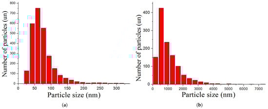 The average size of nanoparticles is 75 nm (Figure 4a), the average size of microparticles is 1039 nm (Figure 4b). The distributions in Figure 4a,b shows submicron particles with sizes greater than 100 nm but less than 1 m in addition to nanoparticles (less than 100 nm in size) and microparticles (more than 1 m in size).