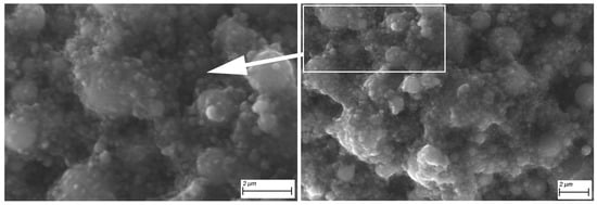 Submicron and nanoparticles located on the surface of large particles (up to several micrometers) in feedstock Ti64 (Figure 6), as well as in powder. This structure of the feedstock ensures its high fluidity, since submicron and nanoparticles act as a solid lubricant for micron particles (ball bearing effect) [,]. Due to the self-lubricating effect of the powder, a higher filling of the feedstock with powder is possible. Thus, the flow rate of the feedstock melt containing 70 vol.% of Ti64 alloy powder was 57 g/10 min, which is an acceptable value for the manufacture of green parts by extrusion of the molten material.