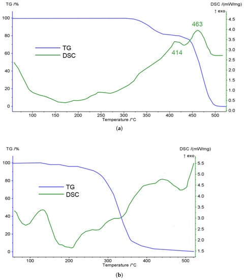 It was suggested that the rest of the polymers could be removed by sintering the samples. According to reference data, dioctyl adipate has a boiling point of 224 °C, at higher temperatures it will be completely removed. Similar data for EVA and rosin could not be found in the literature. Using differential scanning calorimetry (DSC) and thermogravimetry (TG), the decomposition temperatures of EVA and rosin were determined (Figure 7). As follows from the data (Figure 7), polymers completely decompose at temperatures above 500 °C.