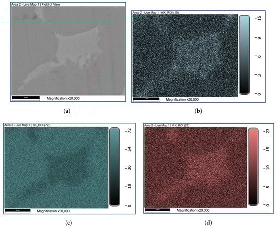 Elemental analysis of the sintered Ti64 sample: (a) image section, (b) aluminum, (c) titanium, (d) vanadium.