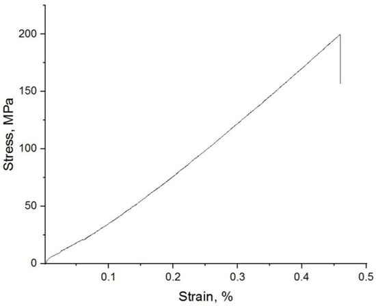 The average bending strength of the samples is 182 ± 16 MPa, which is clearly insufficient for the manufacture of implantable devices. Brittle fracture of the specimens occurs (Figure 11)—the deformation takes place in the elastic region, the loading curve is almost linear, then there is a destruction of the specimen.