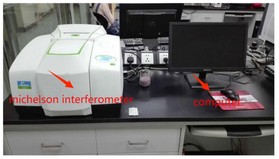The infrared spectra of samples were measured by TENSOR27 FTIR Fourier transform infrared spectrometer produced by Thermo Nicolet Corporation from Madison, WI, USA, as shown in Figure 6. The instrument can measure the spectral range of 8300~30 cm−1. SNR better than 40,000: 1 (peak–peak); resolution less than or equal to 4 cm−1; the test site is the Key Laboratory of Applied Surface and Colloidal Chemistry, College of Chemical Engineering, Shaanxi Normal University, Xi’an, China.