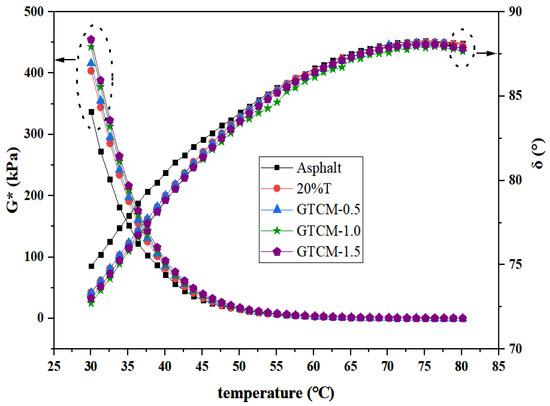 The temperature scanning test of GTCM-modified asphalt was carried out. The outcomes are displayed in Figure 7, Figure 8, Figure 9 and Figure 10, and the rheological properties of GTCM-modified asphalt in the continuous temperature range are analyzed.