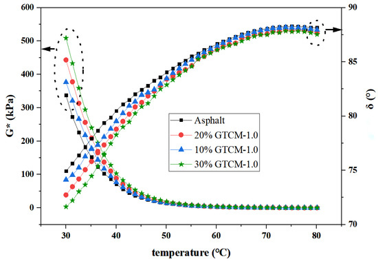- The complex modulus between matrix asphalt and GTCM-modified asphalt is noticeably different in the region of 30 to 50 °C, and the higher the content, the higher the complex shear modulus. When the temperature exceeds 50 °C, the content has less of an impact on the complex modulus of GTCM-modified asphalt, and the complex modulus between different contents is very small, but the overall trend is still 30%. The complex modulus of GTCM-modified asphalt is the largest.