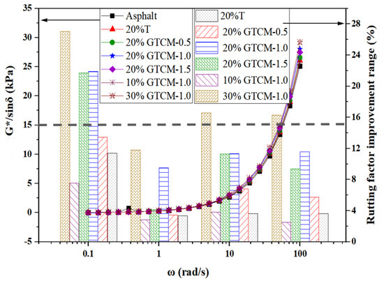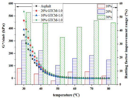- At 60 °C, the rut factor of matrix asphalt is 2.97 kPa, and the rut factor of GTCM-modified asphalt is 3.25 kPa at 10% dosage, which is 9.43% higher than that of matrix asphalt. In comparison to matrix asphalt, the rutting factor of GTCM-modified asphalt with a 20% component is 19.53% greater at 3.55 kPa. The 30% GTCM-modified asphalt has a rutting factor of 4.23 kPa, which is 42.42% more than matrix asphalt.