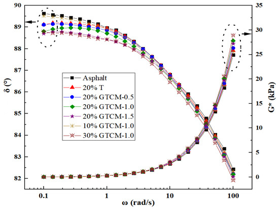 To clarify the viscoelastic properties of GTCM-modified asphalt under different load frequencies, it is necessary to study the rheological properties of GTCM-modified asphalt under different load frequencies. In Figure 11, Figure 12 and Figure 13, the precise test results are displayed.