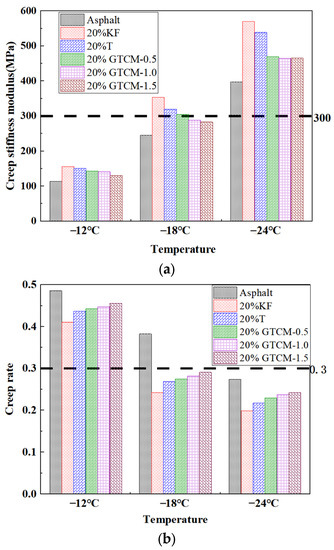 When the ambient temperature is −12 and −18 °C, the creep stiffness modulus of the GTCM-modified asphalt is lower than 300 MPa, and the creep rate is only greater than 0.3 at −12 °C, indicating that the GTCM-modified asphalt has good low-temperature crack resistance at −12 °C.