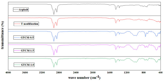 The infrared spectra of matrix asphalt, tourmaline-modified asphalt, GTCM-0.5-modified asphalt, GTCM-1.0-modified asphalt and GTCM-1.5-modified asphalt were tested, respectively. The test results are shown in Figure 17.