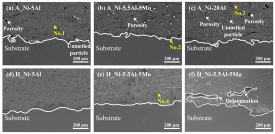 Cross-sectional SEM microstructure images of (a–c) as-sprayed and (d–f) heat-exposed coating layers in SE modes; (a) A_Ni-5Al, (b) A-Ni-5.5Al-5Mo, (c) A_Ni-20Al, (d) H_Ni-5Al, (e) H_Ni-5.5Al-5Mo, and (f) H_Ni-20Al.