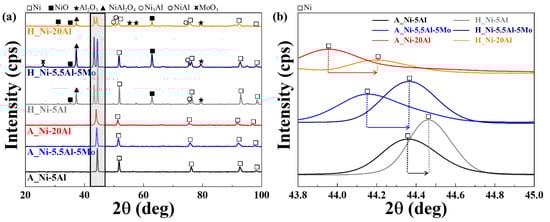 Figure 2 shows the X-ray diffraction values of the as-sprayed and heat-exposed Ni-5Al, Ni-20Al, and Ni-5.5Al-5Mo coating layers. In Figure 2a, which shows the detected XRD peaks of the as-sprayed coating layer, Ni (ICSD 00-004-0850) was detected, and in Figure 2b, which magnifies the gray shaded area on the graph, shows that as the Al content increased, the diffraction peaks of Ni became broader and shifted to lower Bragg angles. This is because, according to the Bragg lattice equation, as the angle decreases, the interplanar spacing increases due to the expansion of the FCC lattice structure [9,27]. This is caused by the different atomic radii of Ni, which acts as a solvent with an atomic radius of 1.24 Å, and Al and Mo, which act as solutes with atomic radii of 1.43 Å and 1.39 Å, respectively. In contrast, after heat exposure, the lattice constant decreased and the FCC structure contracted, showing a higher Bragg angle than the as-sprayed ones. Additionally, while only Ni peaks were detected in the as-sprayed coating layer, NiO, NiAl2O4, Mo oxide, Al2O3, and other compounds were detected in the heat-exposed layers.