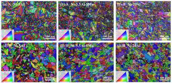 EBSD maps and grain size (GS) of (a–c) as-sprayed and (d–f) heat-exposed coating layers; (a) A_Ni-5Al (GS: 4.41 μm), (b) A-Ni-5.5Al-5Mo (GS: 4.01 μm), and (c) A_Ni-20Al (GS: 3.53 μm), (d) H_Ni-5Al (GS: 7.27 μm), (e) H_Ni-5.5Al-5Mo (GS: 5.50 μm), and (f) H_Ni-20Al (GS: 5.44 μm).
