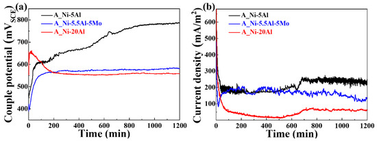 The potential difference between the anode and cathode metals within the electrolyte drives galvanic corrosion. When metals are in contact, their corrosion rates are influenced by their ionization tendencies. Noble metals act as cathodes, reducing corrosion rates, whereas active metals act as anodes, increasing corrosion rates [9]. Figure 4 shows the changes in galvanic potential and current measured in a 3.5 wt.% NaCl solution over 20 h to understand the galvanic behavior between the substrate and coating layer. A galvanic cell was formed due to the potential difference between the substrate and the Ni-Al coating layers, with the coating layer acting as the cathode and the substrate acting as the anode, leading to the corrosion of the substrate. In Figure 4a, the galvanic potential initially showed fluctuations for the first 200 min but then stabilized. However, A_Ni-5Al showed decreasing potential values over time and fluctuated continuously due to the ongoing corrosion of the substrate, which led to the formation of an oxide film on the substrate. The Ni-Al coating layers showed an increased current density over time due to the active oxidation reaction at the anodic substrate, which supplied electrons to the cathode coating layer. As for Ni-5Al, the continuous corrosion of the substrate led to the formation of an oxide film, which was removed by the cathodic coating layer, leading to fluctuating potential and current values.