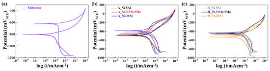 To investigate the resistance to the pitting corrosion in the substrate and coating layer, the CPDP curves are presented in Figure 5. The electrochemical values obtained from the Tafel region are shown in Table 5. By observing the shape of the CPDP curves as shown, similar corrosion behaviors were confirmed for the as-sprayed and heat-exposed Ni-5Al, Ni-5.5Al-5Mo, and Ni-20Al. The coating layers of A_Ni-5Al, A_Ni-5.5Al-5Mo, H_Ni-5.5Al5Mo, and H_Ni-20Al have hysteresis loops. The size of the hysteresis loop is determined by the difference between the forward and reverse current densities, and it shows a decreased loop size with increasing Al content in Figure 5b,c, indicating that the restoration of damaged coating layers is difficult [35]. For the substrate Figure 5a, A_Ni-20Al in Figure 5b, and H_Ni-5Al and H_Ni-5.5Al-5Mo in Figure 5c and Table 5, the reverse potential (Erep) for the transition from the anode to the cathode is more negative than the forward potential (Ecorr), meaning that the corroded area acts as a cathode and continues to corrode. This indicates that the pit continuously grows along with its formation. For A_Ni-5.5Al-5Mo in Figure 5b and H_Ni-20Al in Figure 5c, the reverse potential for the transition from the anode to the cathode is more noble than the forward potential, indicating the resistance of the passive film in the coating layer. Thus, it implies that Erep, which is higher than Ecorr, exhibits higher resistance to localized corrosion in the as-sprayed Ni-5Al and Ni-5.5Al-5Mo [36,37]. Similarly, the corrosion current density also decreases with decreasing Al content, which follows a trend similar to that of the curves. This can be attributed to relatively lower porosity, oxide formation, and intermetallic compound formation compared to those of Ni-20Al. Ni-20Al exhibits a significantly higher current density due to the occurrence of localized corrosion caused by the high impurity content preferentially dissolved in the matrix. The A_Ni-5.5Al-5Mo coating layer has a property that interferes with the ion absorption of Mo, resulting in a stable passivation film [21,25], and the H_Ni-20Al coating layer delays general corrosion due to the formation of an oxide film on the surface after exposure to high temperatures. Furthermore, even after high-temperature exposure, the relatively noble Erep in Ni-20Al compared to Ecorr and lower current density than other coating layers demonstrate better corrosion resistance than the as-sprayed coating layer, which is attributed to the oxide layer formed on the surface resulting from the phase transformation of intermetallic compounds [14,36,37].