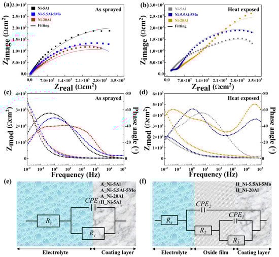 Nyquist plot diagrams of (a) as-sprayed and (b) heat-exposed coating layers, and Bode plot diagrams of (c) as-sprayed and (d) heat-exposed coating layers; (e,f) are equivalent circuit diagrams used for the analysis of impedance spectra for coating layers; (a,c) A_Ni-5Al, A-Ni-5.5Al-5Mo, and A_Ni-20Al, (b,d) H_Ni-5Al, H_Ni-5.5Al-5Mo, and H_Ni-20Al, (e) A_Ni-5Al, A_Ni-5.5Al-5Mo, A_Ni-20Al, and H_Ni-5Al, and (f) H_Ni-5Al, H_Ni-5.5Al-5Mo, and H_Ni-20Al, respectively. Rs: diffusion resistance of the electrolyte, R2: oxide film resistance, R1: charge transfer resistance of the coating surface, CPE1: constant phase element of the coating layer, CPE2: CPE of the oxide film.