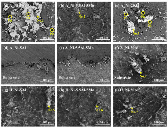 Microstructure of the surface of (a–c) as-sprayed and (g–i) heat-exposed coating layers and the cross-section of (d–f) as-sprayed coating layers after 15 days of immersion test; (a,d) A_Ni-5Al, (b,e) A-Ni-5.5Al-5Mo, (c,f) A_Ni-20Al, (d) H_Ni-5Al, (e) H_Ni-5.5Al-5Mo, and (i) H_Ni-20Al.