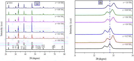Figure 1a describes the Rietveld refinement and fitted XRD profile of Y123/(TiO2)x patterns, where x = 0.0, 0.2, 0.4, 0.6, 0.8, and 1.0 wt.%. The XRD diffraction peaks for all samples exhibited an orthorhombic perovskite structure and belong to space group Pmmm 47 symmetry with ICSD No. 98-002-1157. The (013 and 103) diffraction peaks, which are characteristic of the YBCO phase, can be observed clearly in both non-added and TiO2-added samples. A small amount of impurity phase (indicated as Y211 in the figure) was observed for all added TiO2 patterns. However, there were no detected peaks attributed to TiO2 addition even with a high percentage of TiO2 nanoparticles which accords with previous outcomes stated by [,]. The absence of TiO2 nanoparticle structure in the XRD pattern can be attributed to the mixing effect behaviour, which is due to the relatively higher concentration of the Y123 phase compared to the TiO2. The strong diffraction peaks from the Y123 components can overshadow or mask the weaker diffraction peaks from TiO2 nanoparticles, making it challenging to observe the TiO2 crystal structure in the XRD pattern. Our results showed that the diffraction peaks increased in intensity for all TiO2-added samples, particularly at x = 0.4 wt.% TiO2 concentration, with a noticeable shift of the peak position to the high angle, as presented in Figure 1b. This might be related to thermal cycle stress or the powder pelletising process [].