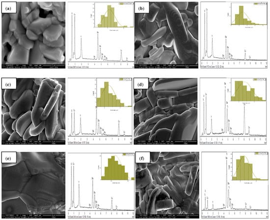 The FESEM analysis was conducted to further investigate the impact of TiO2 nanoparticle addition on the microstructure of YBCO samples. Figure 2a–f shows the surface morphology of the Y123/(TiO2)x composite along with EDX spectra and histograms of the average grain size distribution. As can be seen, the surface morphology was modified under TiO2 inclusion compared to pure one. The grain boundaries were defined as a granular microstructure with shaped rectangular grains distributed uniformly among the sample. The grains were closely packed and elongated with the addition of TiO2. In addition, a sign of partial melting was observed in the grains, leading to the presence of a poorly defined grain boundary. This indicated the fusion of several neighbouring grains, leading to an increase in grain size during melting []. The average grain size was 1.59, 2.82, 2.50, 2.74, 3.04, and 2.48 μm for the samples with x = 0.0, 0.2, 0.4, 0.6, 0.8, and 1.0, respectively. It is clearly evident that the addition of TiO2 increased the grain size of different sintered Y123 samples. It is thought that in ceramic materials, higher sintering temperatures cause partial melting and merging of the grain boundaries, which promote grain size growth [,]. As a result, no pores were detected in these composite samples because the grains of Y123 continued to grow and filled the gaps among the grains. On the other hand, the increase in grain size with TiO2 can create better inter-grain connections, allowing the flow of inter-granular electric current. Hence, the transport critical current Jc is expected to increase with TiO2 additive.
