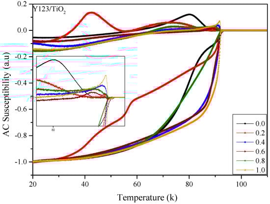 AC susceptibility (χ = χ’ + iχ″) versus temperature of Y123/(TiO2)x at x = 0.0, 0.2, 0.4, 0.6, 0.8, and 1.0 wt.%, measured in a magnetic field of 5 Oe and at a frequency of 295 Hz.