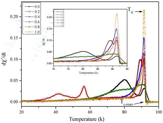 Figure 3 displays the AC susceptibility of real, χ′, and imaginary, χ″, parts for the Y123 superconductor with different percentages of TiO2 at x = (0.0, 0.2, 0.4, 0.6, 0.8, and 1.0 wt.%), measured at Hac = 5 Oe and f = 295 Hz. The values of the phase lock-in temperature, Tcj, and the diamagnetic onset temperature, Tc-onset, were determined from the plot of the peaks dχ´/dT versus T shown in Figure 4. It is noticed that for all added TiO2 samples, the Tc-onset showed a slight decrease with TiO2 inclusion, while Tcj was greatly increased from 80.1 k for the pure Y123 samples to 91.5 K for 1.0 wt.% TiO2. The increase in Tcj implies that the coupling between the grains was further enhanced with TiO2. Based on the real part (χ′-T), it is observed that the transition became sharper with TiO2 addition compared to the non-added sample, which showed tow-step transition. This indicates a strong granular nature of these samples as the addition of TiO2 nanoparticles increased. Furthermore, having a sharp transition in HTSC materials is evidence that the critical current density would be enhanced [].