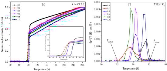 (a) Normalised resistivity versus temperature curve of Y123 samples with various wt.% of TiO2; (b) derivative of resistivity against temperature of Y123 samples with various wt.% of TiO2.