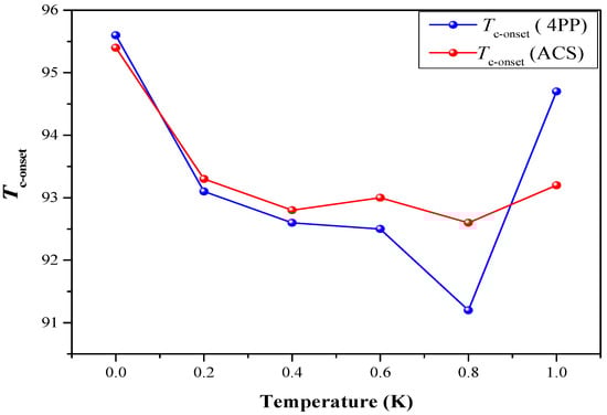 where in this study is 95.6 K for the YBCO phase, and p is the number of the hole concentration. The hole concentration decreased for all doped TiO2 samples from 0.160 to 0.138. The change in oxygen content in the Y123 system may be responsible for this reduction in the charge carrier [,]. The summary of Tc-onset (K), Tc-offset (K), ∆Tc (K), and hole concentration, p, is listed in Table 4.