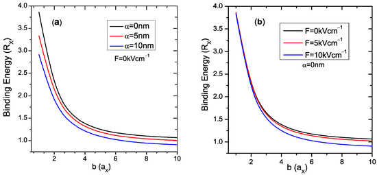 Excitonic variation versus the QD radius b. (a) For and 10 nm. (b) For and 10 kV/cm.