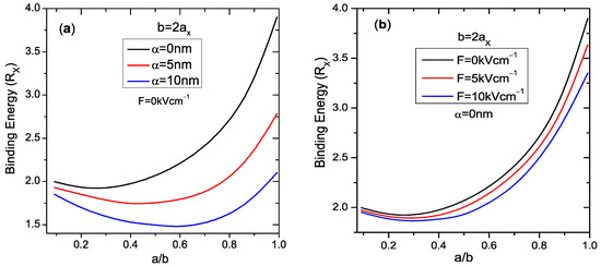Next, the laser effect on the core/shell QD configuration is discussed. In Figure 2a, we show the variation of the exciton’s in relation to the ratio , for , and for and 10 nm. We remark that at zero applied laser field, the variation includes two regions separated by a minimum corresponding to , where when varies from to 1, tends towards the well-known exciton limits (=), i.e., the particles form a free rotation over the surface of the well of GaAs, and consequently, the kinetic energy becomes more important than the Coulomb energy, leading to an augmentation in the exciton . The rise of over the indicates that the system behaves as two-dimensional () material created by some layers of . This value allows us to distinguish between the geometrical system and spherical surface confinement. According to the above assertions, the laser application shows a drastic reduction in the excitonic , especially within the limits, because of the weakness of the confinement induced by the geometrical change resulting from the applying ILF. We also see that the minimum shifts to the higher values of as increases. In Figure 2b, the EF effect on the exciton of a CSQD is plotted for and different values of EF ( and 10 kV/cm). It is observed that diminishes with EF augmentation. Indeed, the application of the EF diminishes the influence of the confinement for both particles because of the increase in the structure size; therefore, reduces. This decrease is more pronounced when tends to 1 but is still inferior to that obtained in the ILF application case (Figure 2a).