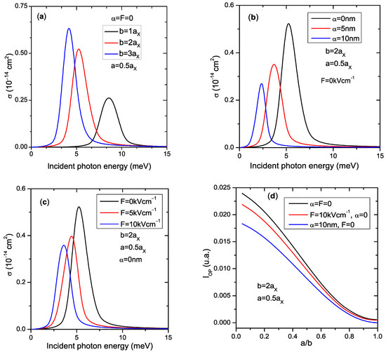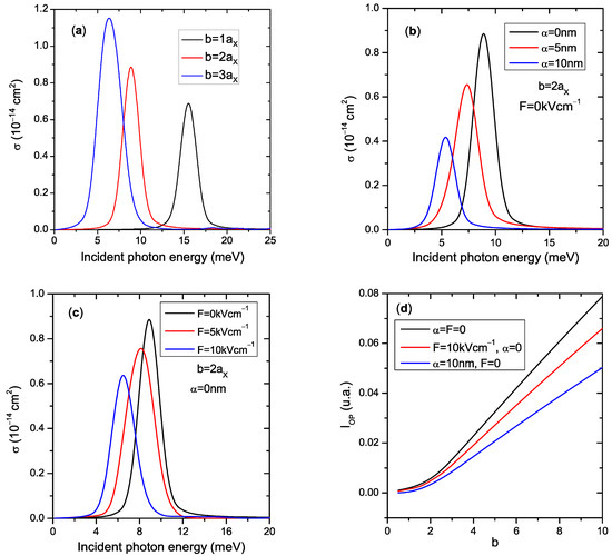 The following topic is photo-ionization cross-section (PICS) behaviors analysis. Its measurement in the nanostructures system is important for comprehending the optical properties of charge carriers within QDs. First, it should be noted that the PICS depends essentially on and the optical integral () variations (Equation (12)). Figure 4a shows the evolution of the PICS of the exciton in relation to the photon energy of excitation , for an SQD (with radius b), and and , in the absence of external perturbations. One can see that the PICS peaks are deeply influenced by the SQD sizes, where the decrease in the structure volume induces a remarkable blue shift (the PICS spectrum moved towards higher energy regions). These behaviors are related to the sensitivity of exciton with the QD size variations. The application of the EF and ILF to the system (Figure 4b and Figure 4c, respectively) show clearly an important impact on the PICS, where under the influence of these two external factors, the PICS peaks show a redshift, i.e., the value corresponding to the peak of the PICS shifts to the region of lower energies, because, as mentioned above, the ILF and EF increase the electron–hole distance. Consequently, the Coulomb interaction of the pair is weakened, and the excitonic correspondingly reduces. Therefore, a redshift of the PICS peak appears. Additionally, we see that the PICS peak intensities reduced (enhanced) with the ILF and EF application (QD radius increment) due to variation. For this reason, we plot in Figure 4d the variation for , nm and 10 kVcm−1. As we can observe from this figure, increases with QD sizes while the ILF and EF reduce it, which leads to the changes observed in the intensity of the PICS peaks.