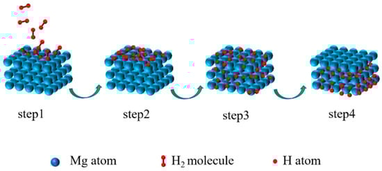 On the one hand, as a hydrogen storage material, the surface layer of Mg-based materials dramatically impacts performance. It directly affects the physical and chemical adsorption and the decomposition of H2 on the material surface, as well as the surface permeation rate of H. These factors ultimately affect the kinetic performance of hydrogen adsorption and desorption. The hydrogen absorption reaction process of materials can be described as follows (Figure 1) []: step 1: H2 is physically adsorbed on the surface of particles by van der Waals forces; step 2: H2 is chemisorbed and dissociated to H on the surface of particles; step 3: H penetrates the lattice through the surface and diffuses to the interior of the alloy; step 4: the alloy phase transforms to the hydride phase. The hydrogen desorption reaction can be considered the reverse process of the hydrogen absorption reaction []. The dissociation energy barrier of H2 on the Mg surface is as high as 218 kJ mol−1 H2 []. The slow surface permeation rate of H on the material surface is also a key factor affecting the hydrogen absorption reaction kinetics of Mg-based materials. As is known, Mg-based materials are extremely prone to oxidation during the preparation process. The oxide layer formed on the surface hinders the decomposition of H2 and the surface permeation of H, leading to a significant decrease in the hydrogen absorption/desorption rate []. Moreover, prolonged hydrogen absorption/desorption can also lead to the pulverization of the particles and the poisoning of impurity gas, which reduces the hydrogen storage capacity of the material and shortens its service life. Thus, in order to enhance the hydrogen absorption kinetics, it is necessary to increase the rate of decomposition of H2 on the material surface, the permeation rate of H on the surface, and the ability of the surface to resist impurity gas poisoning. However, these all directly depend on the composition, structure, and state of the material surface.